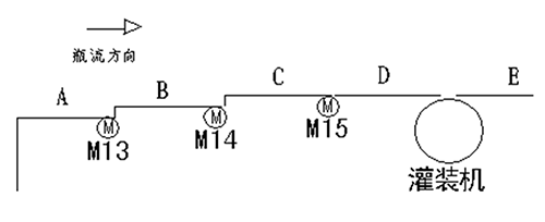 變頻器1﹑2﹑3的調(diào)速方式為兩種:1.來自灌裝機主機變頻器的模擬信號DC0~10V,經(jīng)過隔離器轉(zhuǎn)換為線性DC0~10V,再經(jīng)過電位器分壓作為變頻器1﹑2﹑3 的給定信號,以控制電機M13﹑M14﹑M15,這樣可以做到輸送帶與灌裝機的速度很好匹配;2.采用多段速控制端子SD﹑STF﹑RL﹑RM﹑RH,通過PLC編程,由PLC發(fā)出控制信號以控制速度。PLC根據(jù)灌裝機操作臺發(fā)出的信號來判斷使用那種速度控制方式,又根據(jù)瓶流情況選擇高低速。在模擬信號控制時是通過輔助繼電器KA1和KA2,KA3和KA4,KA5和KA6的組合,經(jīng)W1﹑W2,W3﹑W4,W5﹑W6分壓控制變頻器輸出速度。在多段速時通過PLC的輸出Y10﹑Y11﹑Y12﹑Y13,Y20﹑Y21﹑Y22﹑Y23,Y24﹑Y25﹑Y26﹑Y27分別調(diào)節(jié)各個變頻器的輸出頻率以達(dá)到多段輸送帶的速度匹配及與灌裝機的速度匹配。在模擬控制方式調(diào)整中,電位器分壓比的調(diào)整是個關(guān)鍵,通過生產(chǎn)調(diào)試中摸索,終于找到了比較好的速度匹配。分壓比一旦調(diào)好,不得隨意改動。