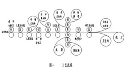 嬰兒紙尿褲生產(chǎn)線機(jī)主要設(shè)備由以下組成: 8套開卷裝置、 8臺(tái)復(fù)合輥和壓輥、6臺(tái)切刀輥及折疊和疊碼裝置.其工藝流程如圖1所示。