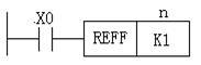(2)濾波調(diào)整指令REFF REFF(P)指令的編號為FNC51。在FX系列PLC中X0~X17使用了數(shù)字濾波器,用REFF指令可調(diào)節(jié)其濾波時間,范圍為0~60ms(實際上由于輸入端有RL濾波,所以最小濾波時間為50μs)。如圖2所示,當(dāng)X0接通時,執(zhí)行REFF指令,濾波時間常數(shù)被設(shè)定為1ms。