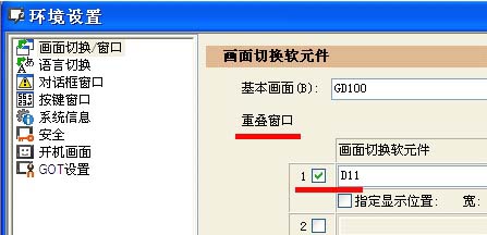 在環(huán)境設置對話框中,重疊窗口這一欄選中第 1 個復選框,然后在畫面切換軟元件中輸入一個字元件。其它地方不做修改,點擊確定。
