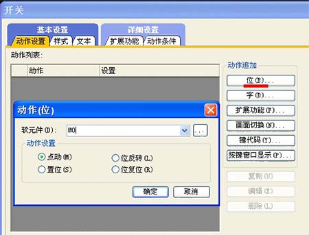 在動作設置里面點擊位(B),輸入軟元件名:M0 并把動作設置為點動,點擊確定。