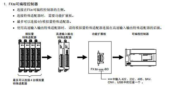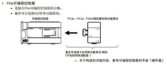 下面的圖片是小編從三菱FX3U系列PLC用戶手冊(cè)(硬件篇)上截下來的,都是一些關(guān)于三菱FX3U系列PLC連接三菱PLC擴(kuò)展模塊的說明以及方法!