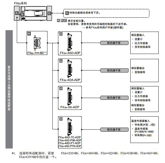 據(jù)小編了解,三菱FX3U系列PLC最多可以連接4臺(tái)三菱PLC模擬量特殊適配器,最多可以連接8臺(tái)三菱PLC特殊功能模塊。