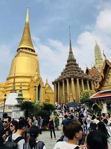 第一站:首先是到泰國(guó)必游的大皇宮與玉佛寺,游大皇宮和寺有許多的禮儀規(guī)矩,如:在入大皇宮時(shí),不能穿拖鞋,上衣不能穿無(wú)袖下身著裝必須蓋過(guò)膝蓋,入寺廟需脫鞋等等,不過(guò)在此之前海藍(lán)的小伙伴早就做好相關(guān)的功課,當(dāng)然是順利進(jìn)行游玩,小編提醒:還沒(méi)去過(guò)泰國(guó)旅游的小伙伴在去泰國(guó)一定要做好相關(guān)功課,了解當(dāng)?shù)亓?xí)俗文化,不然會(huì)被擋在門(mén)外喲!